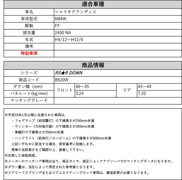 【必ずご確認ください。】 メーカー欠品や受注生産品があります。納期確認お願いします。 ◇対 応 車 種 表 シリーズ:RS★R DOWN 品 番:B620W 車 名:MITSUBISHI シャリオグランディス 型 式:N84W(FF) 排気量:2400 NA 年 式:H9/12〜H12/6 ダウン幅(mm):Fr 40〜35 / Rr 45〜40 バネレート(kg/mm):Fr 3.24 / Rr...